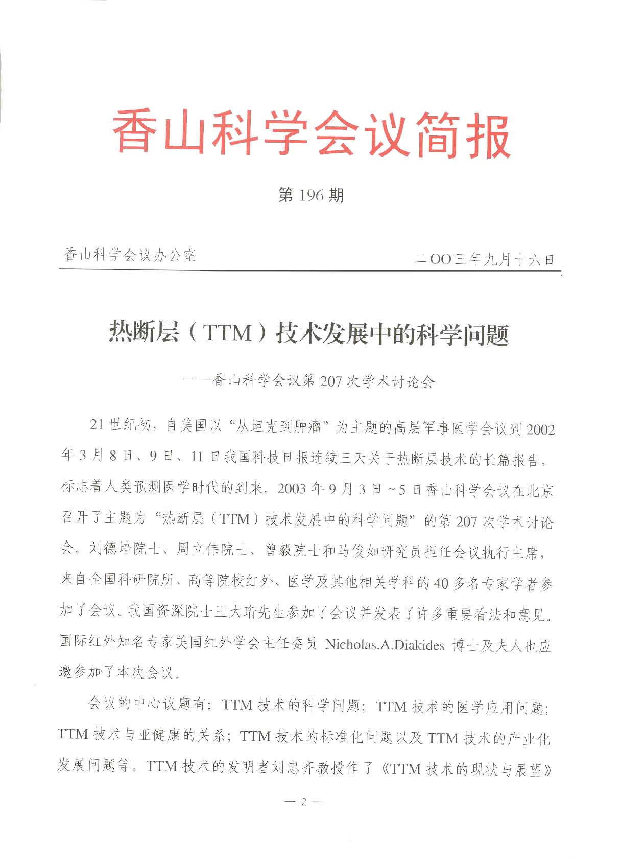 2003年9月香山科學會議發(fā)布香山科學會議簡報(第196期)熱斷層(TTM)技術發(fā)展中的科學問題